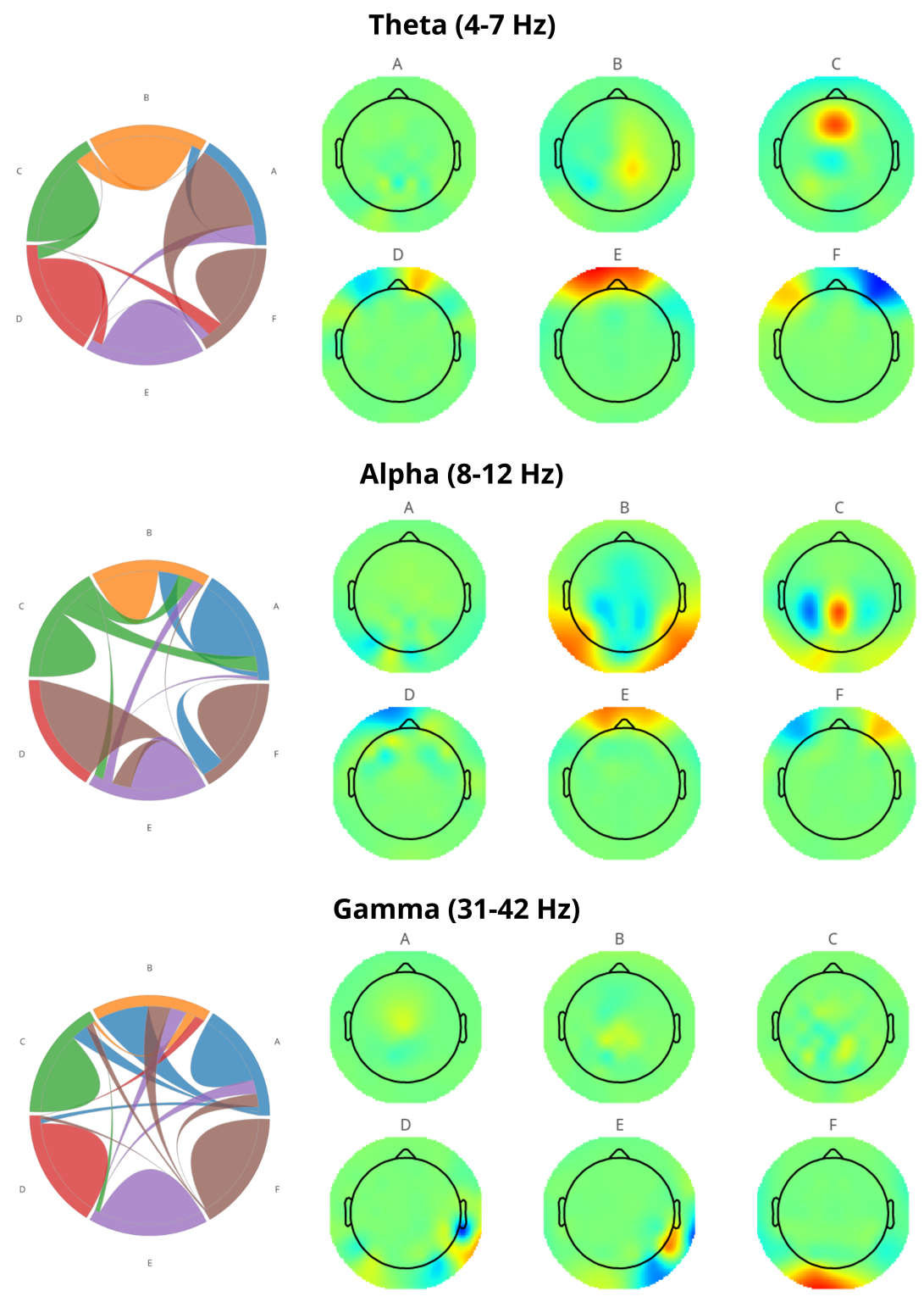 The connectivity patterns we observed revealed fascinating neural signatures across frequency bands. In the theta band, we found increased frontal-midline activity—a known signature of focused-attention meditation—within a complex interplay of activations in right parietal and frontal pole regions. Alpha band activity showed distinct increases in midline parietal regions complemented by left parietal reduction, partially mapping onto trait-level mindfulness. Meanwhile, gamma band activity revealed increased occipitoparietal activity causally influencing midline parietal regions.