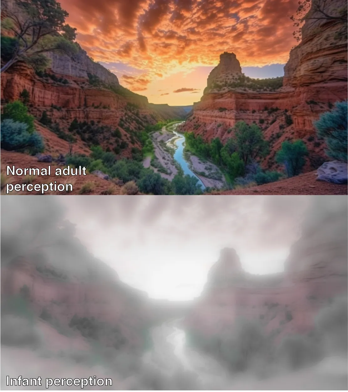 The paper also sheds light into ‘what it is like’ to be a baby. We know that seeing is much more immature in babies than hearing, for example (see the image below for a theoretical depiction). Furthermore, this work suggests that, at any point in time, infants are aware of fewer items than adults, and can take longer to grasp what’s in front of them, but they can easily process more diverse information, such as sounds from other languages, than their older selves.